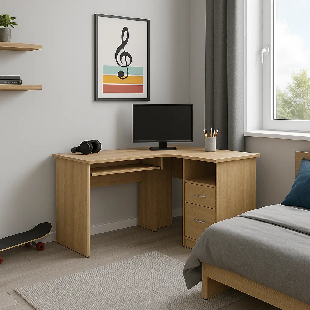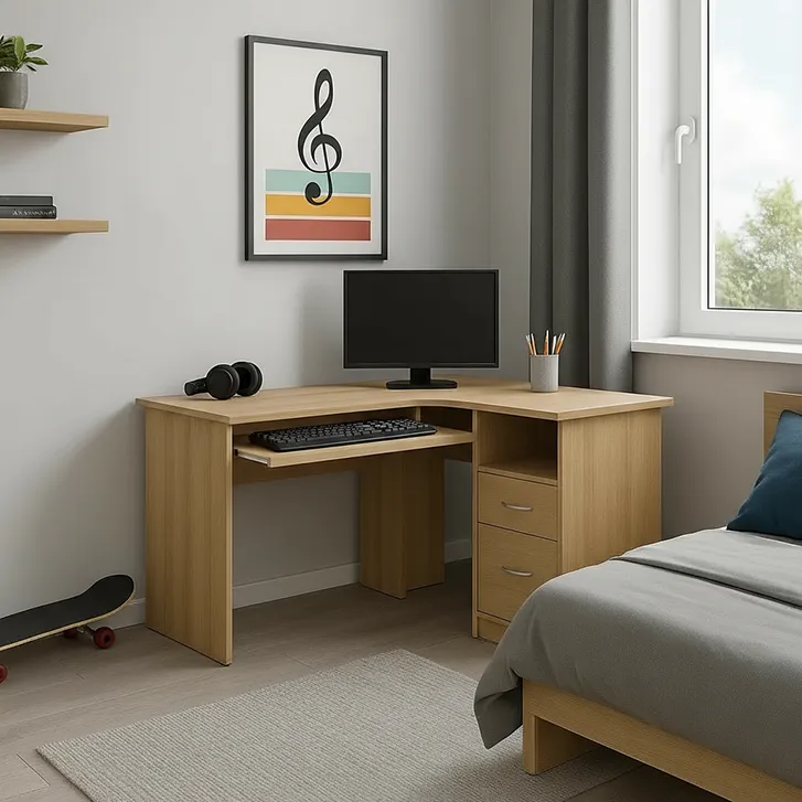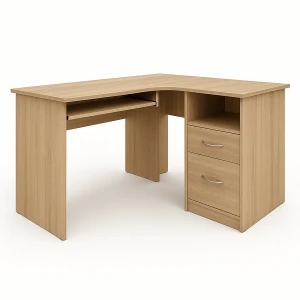 Biurko narożne z półką na klawiaturę i szufladami