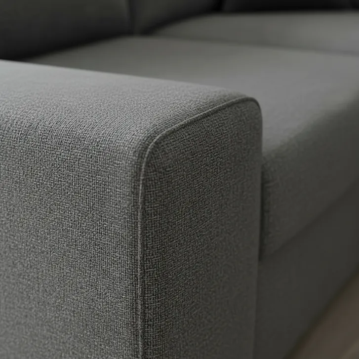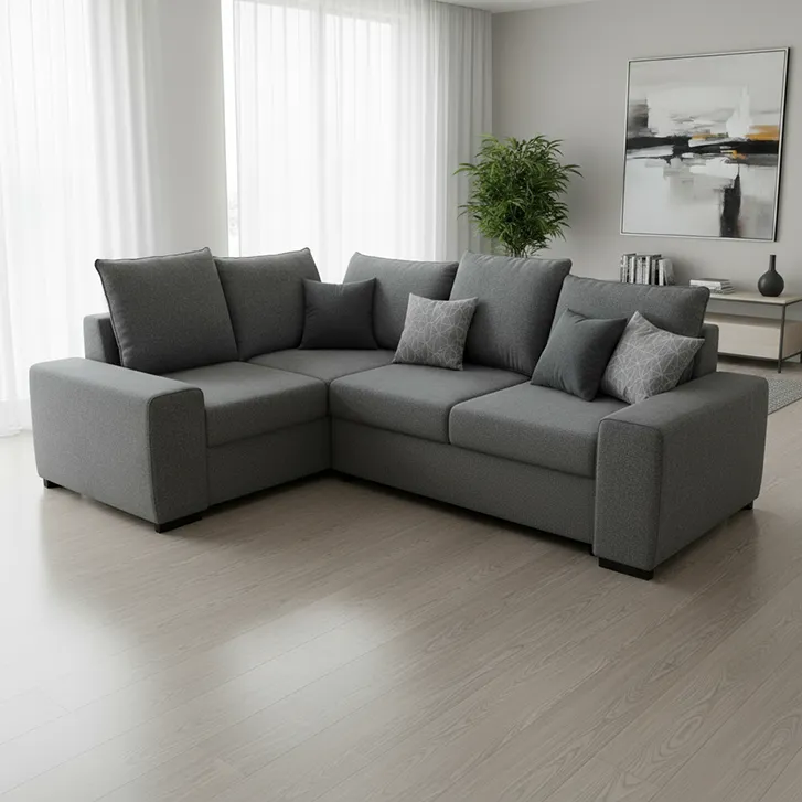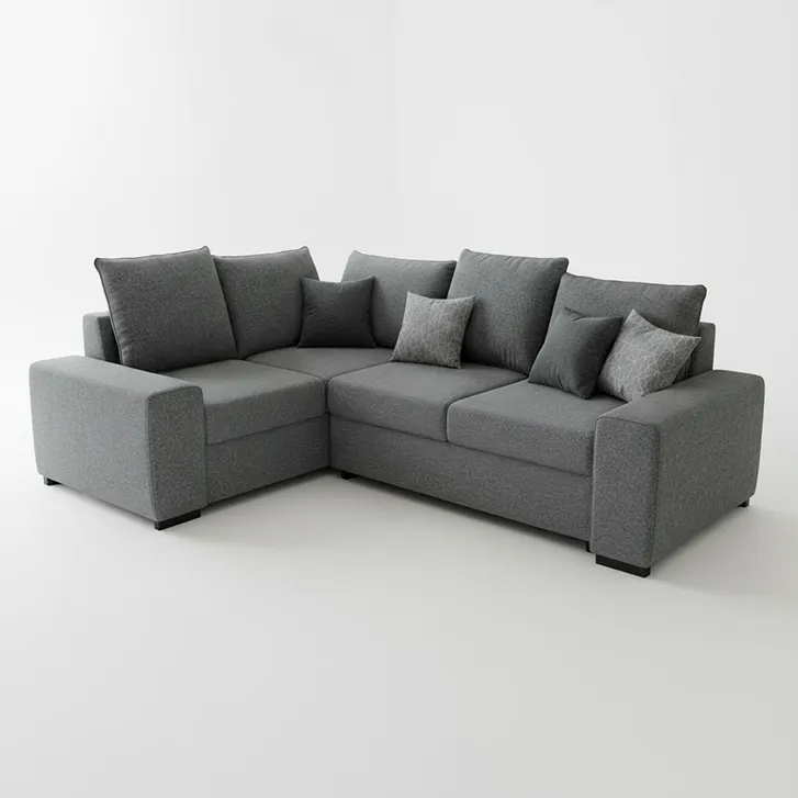 Szara sofa narożna rozkładana z pojemnikiem na pościel to funkcjonalny i elegancki mebel do salonu. Łączy wygodę codziennego użytkowania z praktycznymi rozwiązaniami – łatwo zmienia się w komfortowe miejsce do spania, a pojemnik zapewnia dodatkową przestrzeń do przechowywania. Neutralny, szary kolor pasuje do różnych aranżacji wnętrz.
